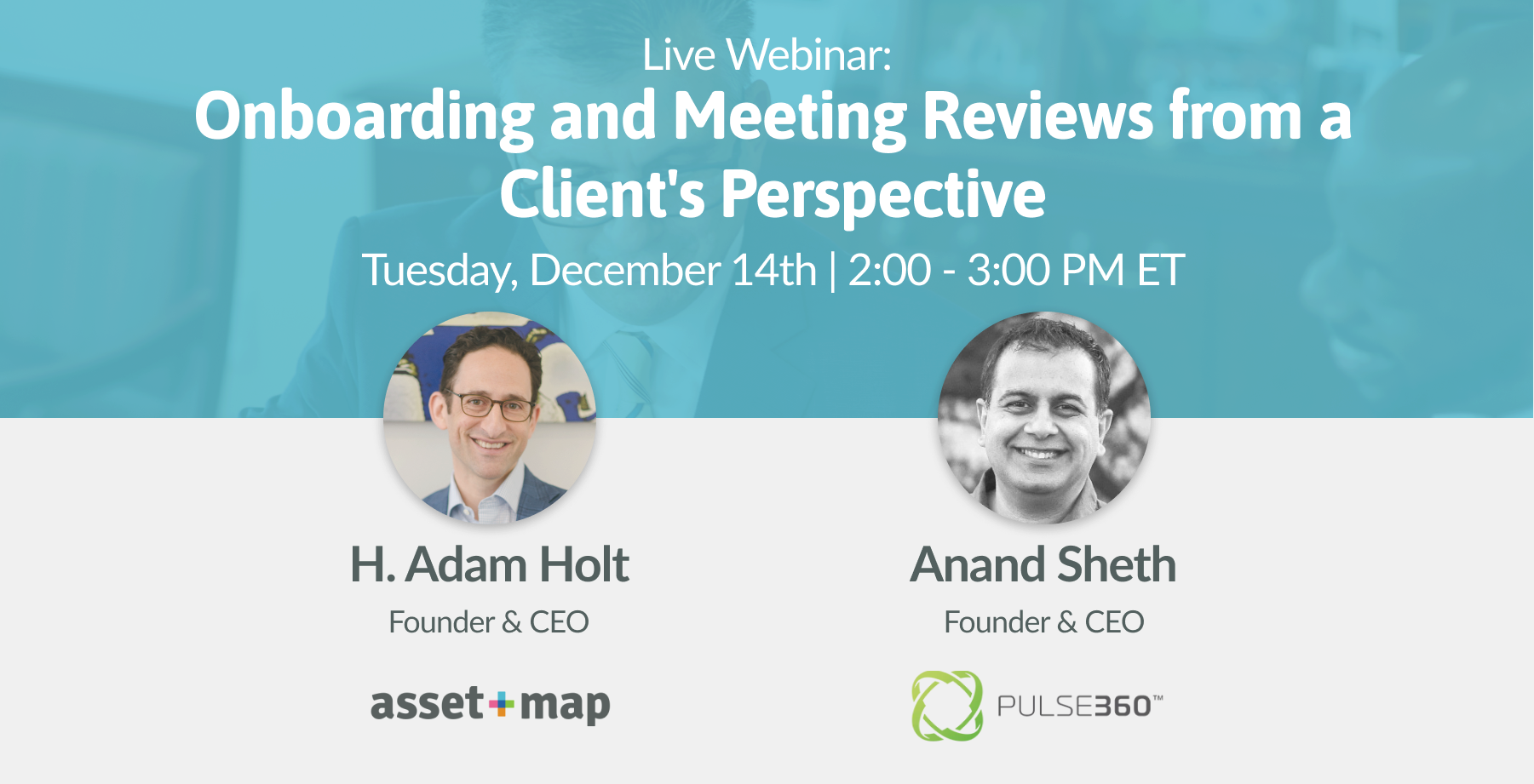 Join H. Adam Holt, Founder and CEO of Asset-Map, and Anand Sheth, Founder and CEO of Pulse360, as they walk through best practices for optimizing your customer journey and how to easily customize your marketing and onboarding materials to turn prospects into lifelong clients.